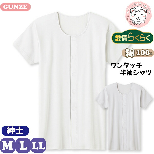 グンゼ 愛情らくらく 半袖 ワンタッチシャツ 前あき 綿100% 保湿 抗菌防臭 ワンタッチテープ M/L/LL | 脇縫いなし 洗濯タグなし 無地 メンズ シニア 介護 綿 下着 肌着 インナー HWB213 GUNZE