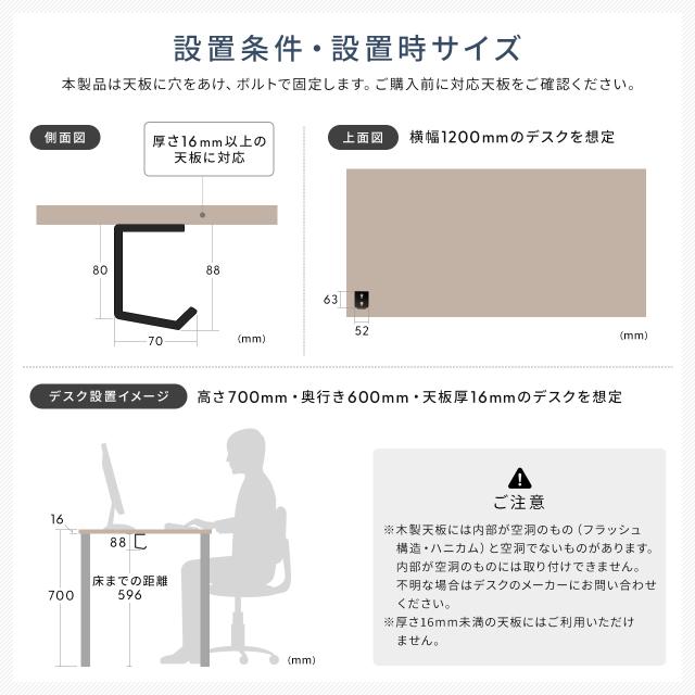 ■対応機種:厚さ16mm以上の天板で、付属タッピングボルト(M4×16mm)での取り付けが可能なデスク