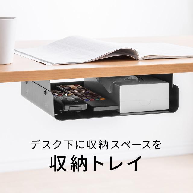 ⇒ご購入の前にご確認下さい天板裏にネジ固定してB5サイズの手帳や本、リモコンや小物などを収納できる収納トレイ。トレイは丈夫なスチール製で、デスクや作業台、ラックの棚板など様々な箇所に取り付け可能。高さ可変ができるので、ティッシュBOXの収納も可能。【WEB限定商品】