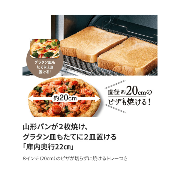 ●山形パンが2枚焼け、グラタン皿もたてに2皿置ける「庫内奥行22cm」