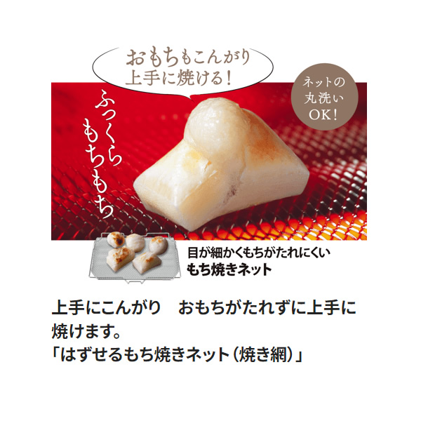 ●丸洗いOK!「はずせるもち焼きネット(焼き網)」&「スライド式くず受皿」