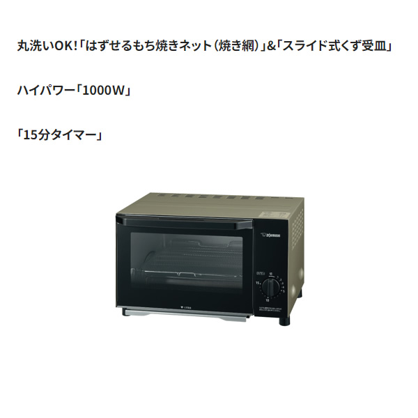 山形パンが2枚焼け、グラタン皿もたてに2皿置ける。 ●山形パンが2枚焼け、グラタン皿もたてに2皿置ける「庫内奥行22cm」 8インチ(20cm)のピザが切らずに焼けるトレーつき ●上手にこんがり おもちがたれずに上手に焼けます。 「はずせるもち焼きネット(焼き網)」 ●丸洗いOK!「はずせるもち焼きネット(焼き網)」&「スライド式くず受皿」 ●ハイパワー「1000W」 ●「15分タイマー」 ■消費電力(W):1000W ■タイマー:15分 ■外形寸法 幅×奥行×高さ(約cm):38.5cm ×27cm×23cm ■庫内寸法 幅×奥行×高さ(約cm):26cm×22cm×10.5cm ■トレー内寸 幅×奥行(約cm):22.7cm×20cm ■本体質量(約kg):3.9kg ※記載は商品仕様の一部です。仕様説明不足等の理由での返品はできません。特に適合等は必ずご確認ください。