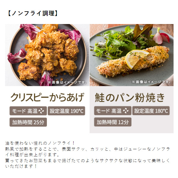 熱風で加熱をすることで、表面サクッ、カリッと、中はジューシーなノンフライ料理が出来上がります。