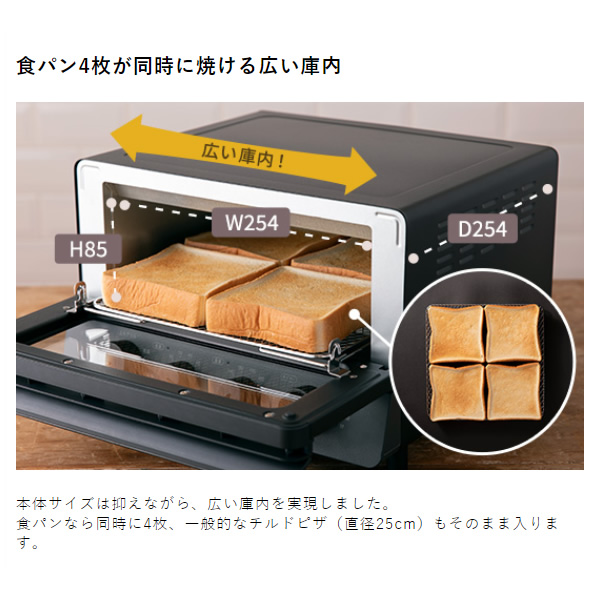 食パンなら同時に4枚、一般的なチルドピザ(直径25cm)もそのまま入ります。