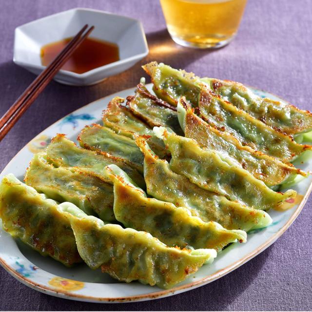 緑の皮にまずはかぶりついて。ザクザクとした野沢菜の食感が小気味よく、程よい塩気と豚肉の甘みがじゅわっと溢れ出る。長野の老舗漬物屋とコラボしたこの餃子、無添加の野沢菜漬けを刻み方や分量まで緻密に計算して閉じ込めた。軽やかな口あたりはビール片手にいくらでも食べられそう。