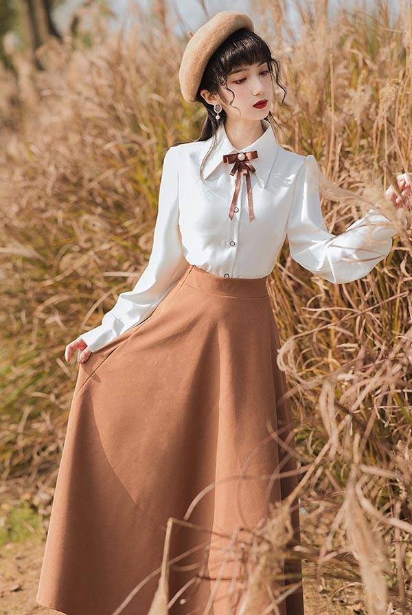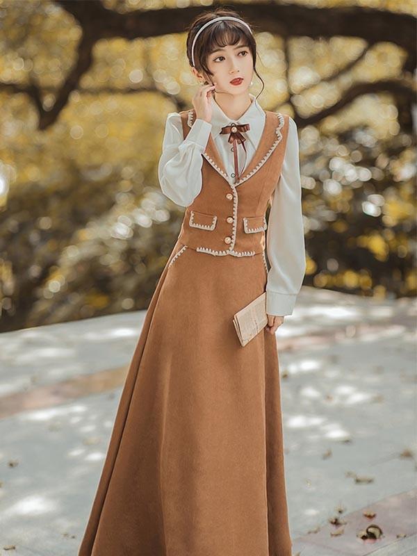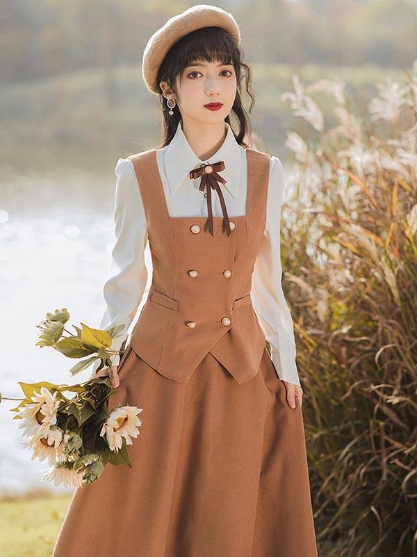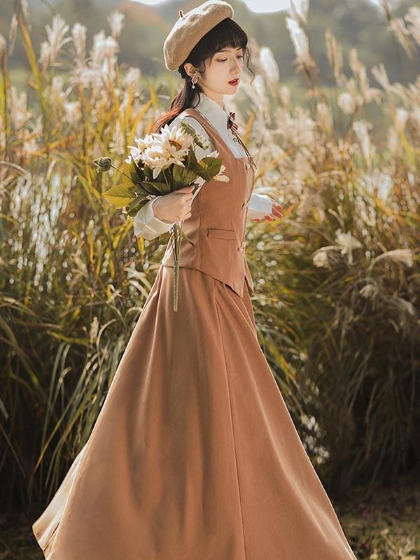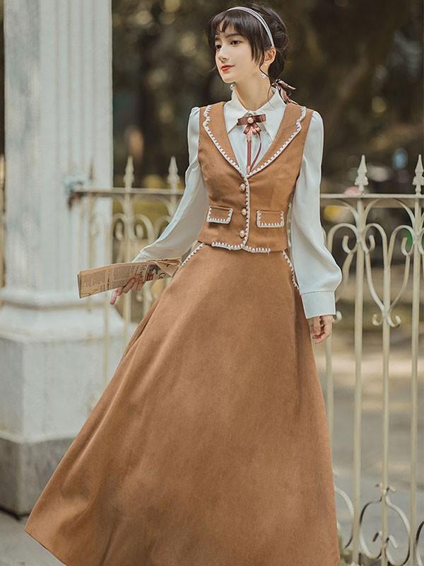 lolita cla クラロリ 日常 フレアスカート ベスト シャツ レディース ロング ジャンスカ クラシック レトロロングスカート 大人 可愛い ベージュ S M L XL dr130t2t2l9