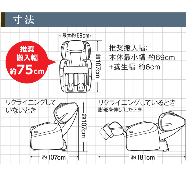 ■本体寸法 リクライニング時(約):幅69×奥行181×高さ83cm:脚部最大使用時