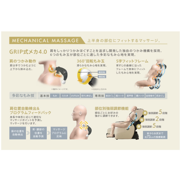 肩はしっかりつかむようにもみ、背中から腰はぴったりとフィットするようにもみほぐす「GRIP式メカ4.0」搭載。
