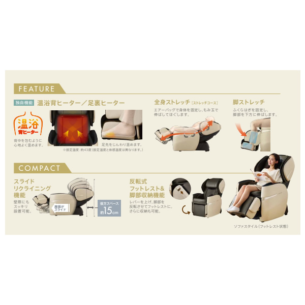 背中を包むように心地よく温める「温浴背ヒーター」と足先をじんわり温める「足裏ヒーター」を搭載しています。