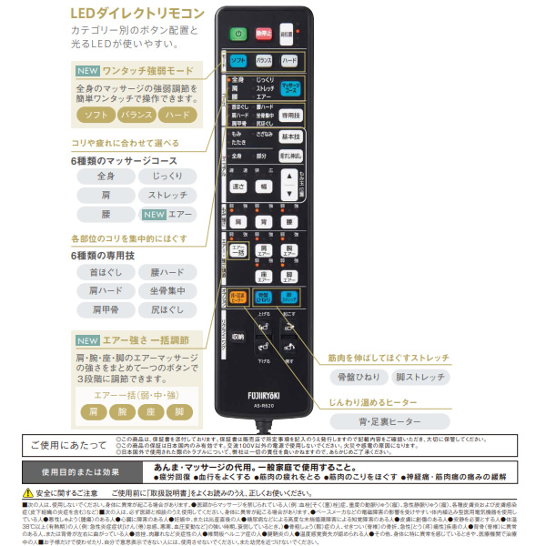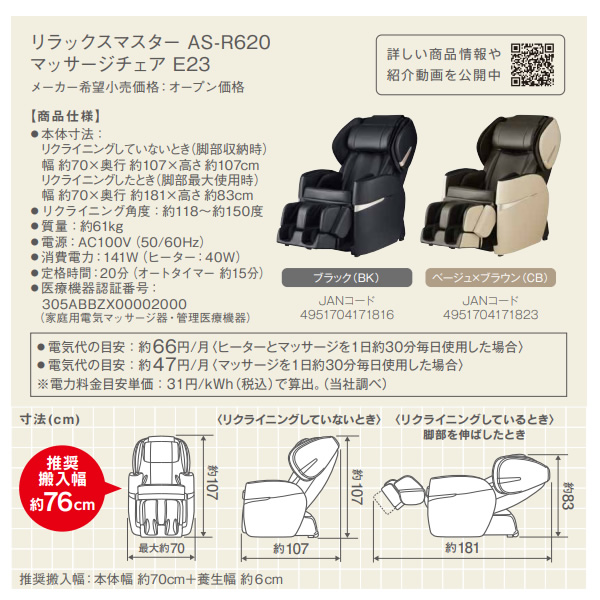RELAX MASTER (リラックスマスター)マッサージチェア E23 AS-R620 ブラック ※こちらの製品は、メーカーにより使用対象者が制限されている場合がございます。場合によってはお体を傷つける原因にもなりかねます。トラブルを避けるために事前に家電量販店やショールームでのお試しをお勧めしております。ご注文後にお体に合わなかったなどの理由でのご返品は承っておりませんので何卒ご確認とご理解の上、ご注文いただきますよう宜しくお願い致します。 ■販売名:マッサージチェア E23 ■品番:AS-R620 ■医療機器認証番号:305ABBZX00002000(家庭用電気マッサージ器・管理医療機器) ■定格電源(50/60Hz):AC100V ■定格時間:20分 ■定格入力(消費電力)(50/60Hz):141W(ヒーターのみ40W) ■待機電力:8W ■張り地:PVCレザー ■本体寸法 通常(約):幅70×奥行107×高さ107cm:脚部収納時 ■本体寸法 リクライニング時(約):幅70×奥行181×高さ83cm:脚部最大使用時 ■本体質量(約):61kg ※記載は商品仕様の一部です。仕様説明不足等の理由での返品はできません。特に適合等は必ずご確認ください。