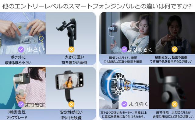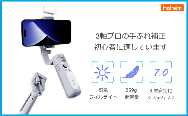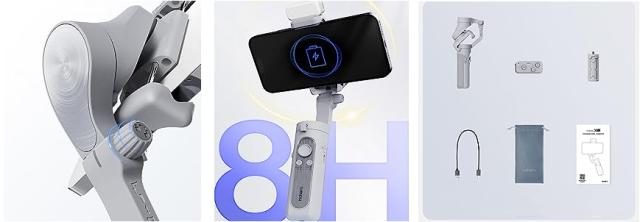 この3軸スマートフォンジンバルは、移動中のクリエイター向けに設計されており、重量はわずか259gです。
