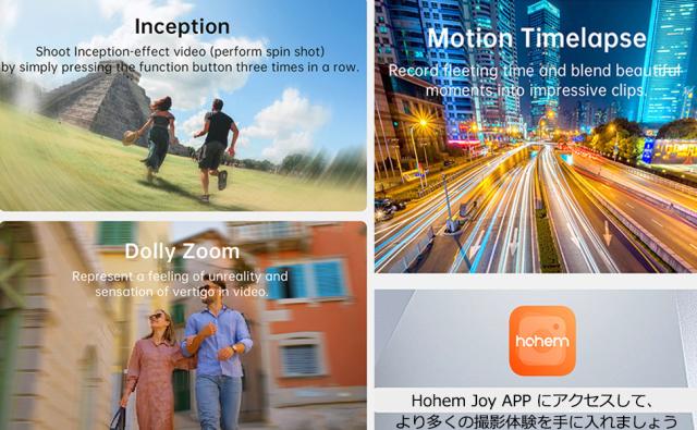【簡単操作・多彩な使い方】機能ボタンを1回押すだけで、ランドスケープモードとポートレートモードをすばやく切り替えることができます。機能ボタンを3回押すだけで、インセプションモード(スピンショット)をすばやく有効にできます。Mボタンを1回押すだけで、ジンバルモードを簡単に切り替えることができます。