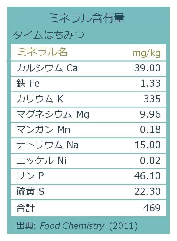 タイムはちみつに含まれるミネラルは、カルシウム、鉄、マグネシウム、リン、カリウムです(4)。