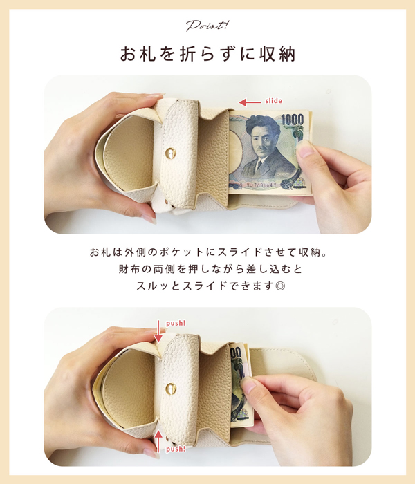 お札はするっとスライドさせて、折らずに収納が可能です!