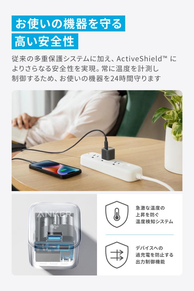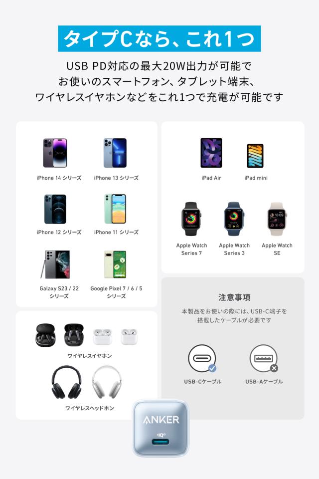 ・お使いの機器を守る高い安全性: 従来の多重保護システムに加え、ActiveShieldによるさらなる安全性を実現。常に温度を計測し制御するため、お使いの機器を24時間守ります。 タイプCなら、これ1つ:USB PD対応の最大20W出力が可能で お使いのスマートフォン、タブレット端末、ワイヤレスイヤホンなどをこれ1つで充電できます。