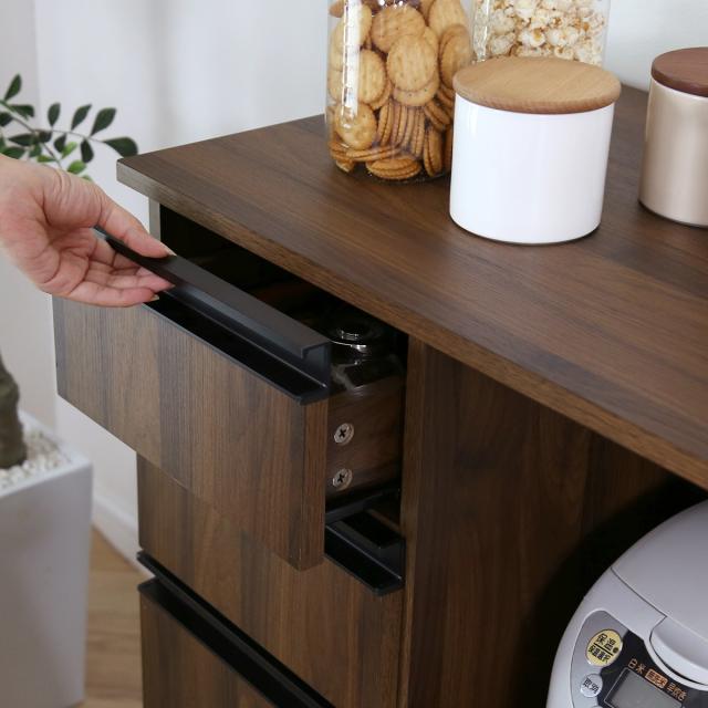 開閉がスムーズで取り出しやすい引き出しも備わっています。カトラリーやキッチンツールも手軽に取り出せ、効率的なキッチン作業をサポートします。