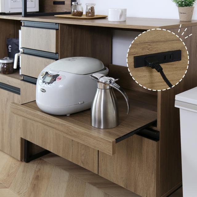 使用するときだけサッと前に引き出せるスライドトレーは、少しの力でも出し入れしやすい仕様になっているので家電を置いても快適にご使用いただけます。2口コンセントが付いているので配線に困ることもなく、蒸気が出る炊飯器やケトル等の家電を置いても背面がオープンなので湿気がこもる心配もありません。