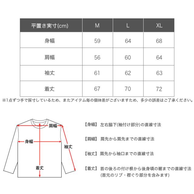 平置き実寸(cm)[身幅/肩幅/袖丈/着丈]:Mサイズ 59/56/61/67・Lサイズ 64/60/62/70・XLサイズ 68/64/63/72 ※多少の誤差はご了承ください