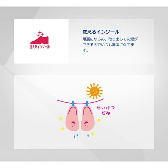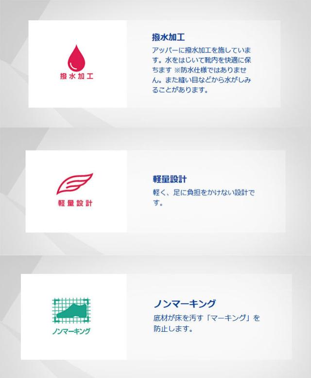 院内使用に配慮したノンマーキングソール。軽量設計。上甲部分は汚れにくい合皮を使用し、サイド部分は蒸れにくいよう通気性の良いメッシュ素材を使用しています。中敷は「Ag+抗菌防臭」を搭載。銀イオンの抗菌作用でにおいのもととなる菌の増殖を抑制し、防臭効果を発揮します。