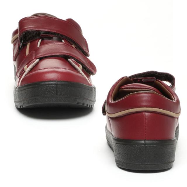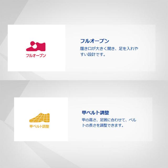 リハビリシーンを想定した、日本製の装具対応シューズです。装具や甲の高さ、足囲に合わせて甲ベルトの長さを調整できます。履き口を大きく広げられるので、装具をつけた足でも着脱が楽にできます。装具着用時は中敷を外してサイズ調整できます。ソールは、軽量性、弾力性、防滑性に富んだ「ベステック」底材で、快適な歩行をサポートします。