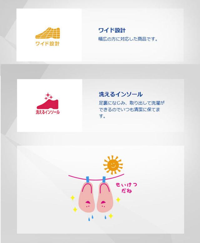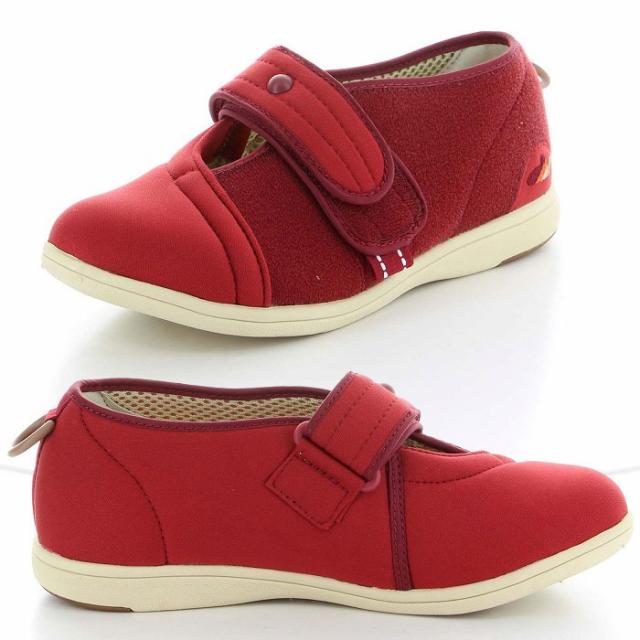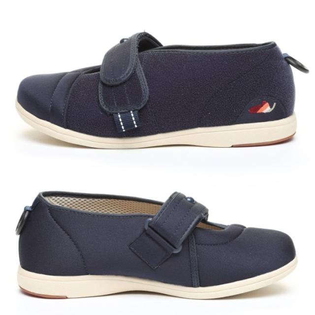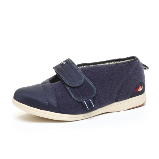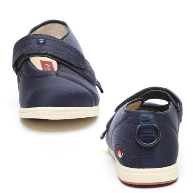 リハビリシーンも想定した、室内、室外どちらでも履ける軽量設計のシューズです。靴形状はつま先が上がった「つまずき防止」設計になっています。履き口を大きく広げられるので、むくみのある方でも着脱が楽にできます。中敷を外してサイズ調整できます。踵にやわらかい樹脂リングが付いていて、リングを引っ張りながら履くと楽に履くことができます。甲の高さ、足囲に合わせて甲ベルトの長さを調整できます。