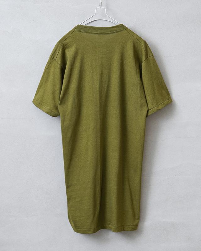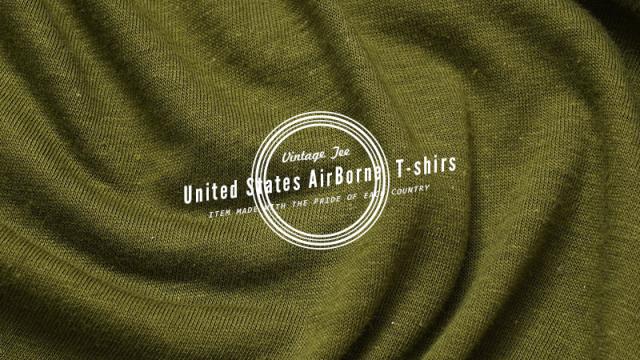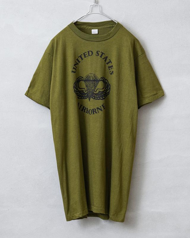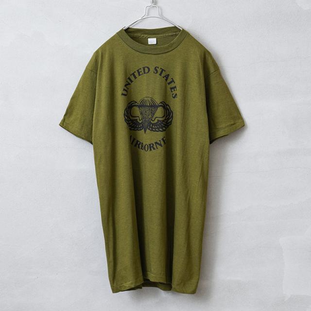 メリカ陸軍空挺部隊の部隊章が中央にプリントされた、1970年代から80年代頃のアメリカ製民生品Tシャツです。 コットン100%の目が詰まった生地は柔らかく適度な伸縮性があり、肌触りがよく心地よい着用感が得られます。ビンテージ感ある生地感とやや明るみのあるアーミーグリーンのカラーは雰囲気抜群です。袖口と裾は、ビンテージ Tシャツでよく見られるシングルステッチで仕上げられており縫い目が目立たないシンプルな見た目が特徴です。胴周りを1枚の布で仕上げた丸胴仕様は、サイドに縫製をなくすことで素肌へのストレスを軽減しています。シルエットはやや着丈が長めで、洗うと縦に縮みが入り、目が詰まった生地は横方向へ引っ張られると伸縮することで、身体に合った状態へと馴染んでいきフィット感を高めます。