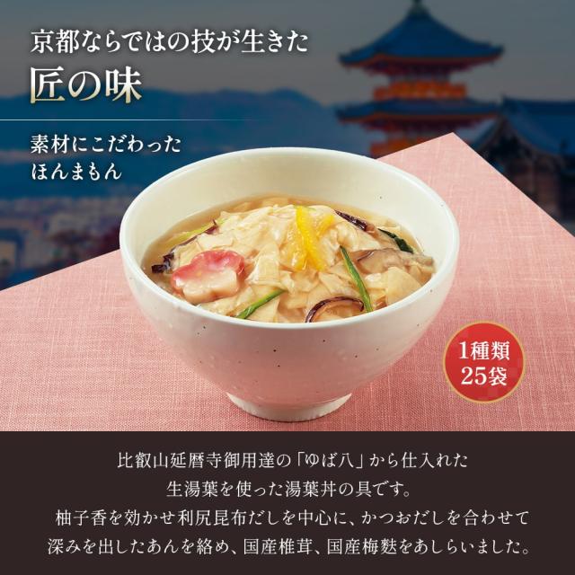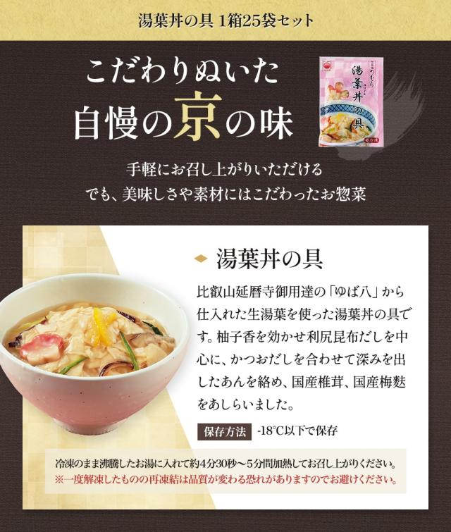 比叡山延暦寺御用達の「ゆば八」から仕入れた生湯葉を使った湯葉丼の具です。柚子香を効かせ利尻昆布だしを中心に、かつおだしを合わせて深みを出したあんを絡め、国産椎茸、国産梅麩をあしらいました。 温めてご飯にかけるだけでお手軽に京都の味がお楽しみ頂けます。
