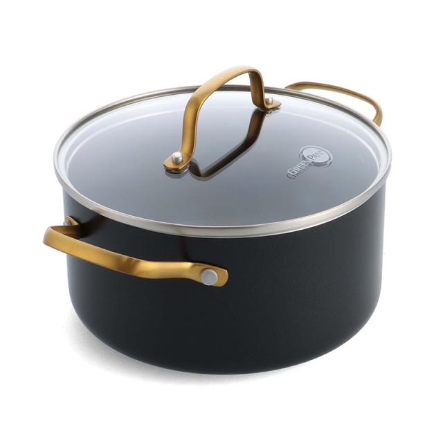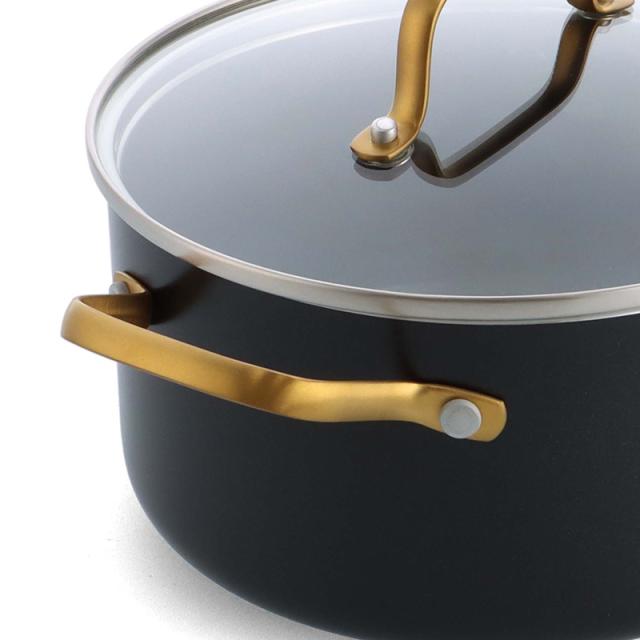 有害物質を一切使用していない調理器具の開発を手掛けるGreenPan(グリーンパン)のキャセロール20cm。ノンスティック・セラミックコーティングが施され、熱伝導に優れたこびりつきにくいキャセロールです。ブラックのボディとゴールドのハンドルの上品なデザインが魅力です。