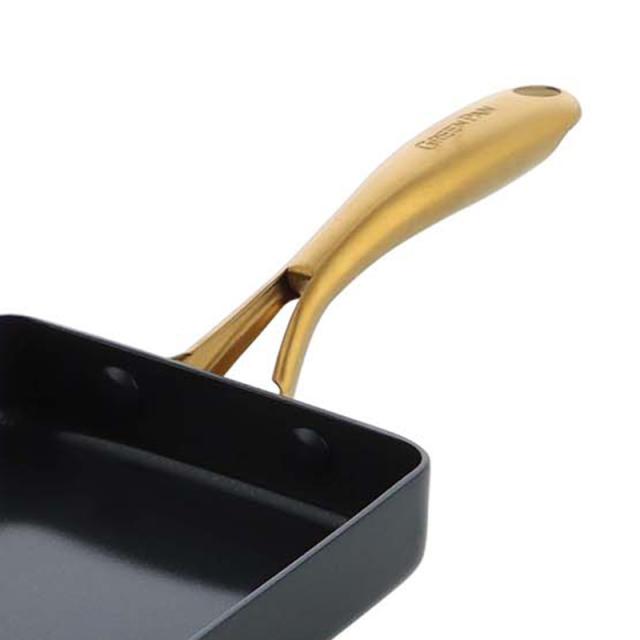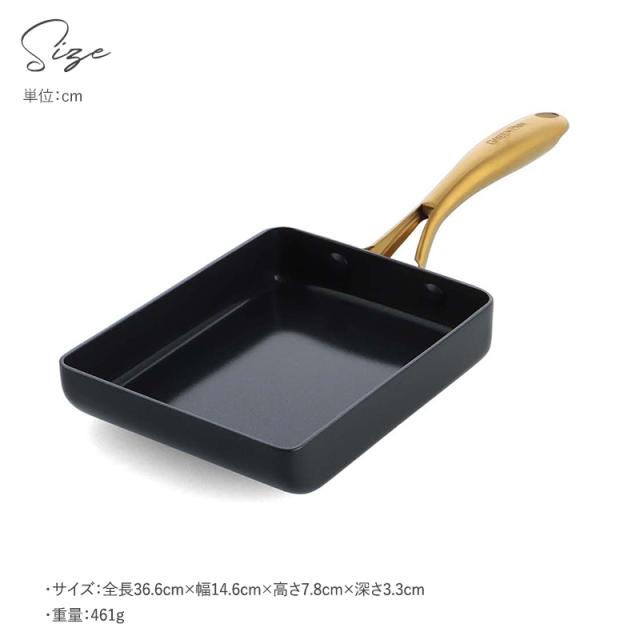 有害物質を含まないのに焦げ付きにくい、安心加工のエッグパン。ブラック×ゴールドの上品なデザインが魅力。