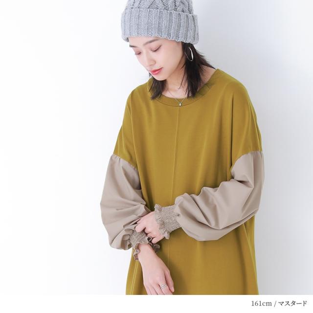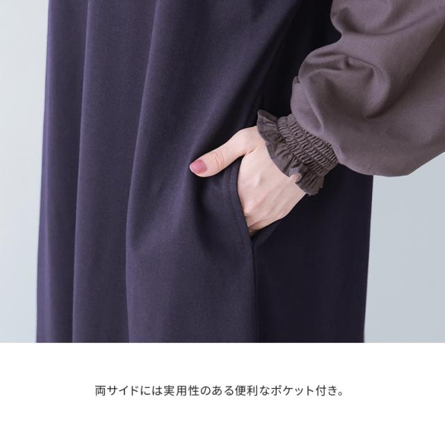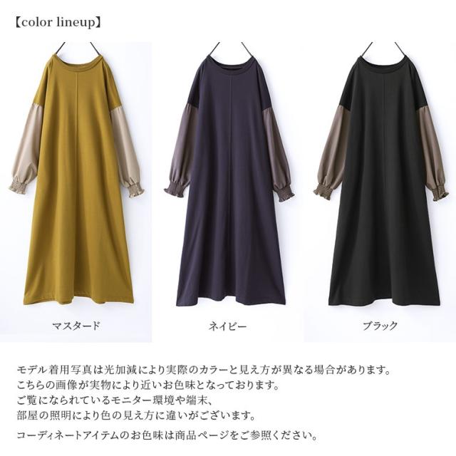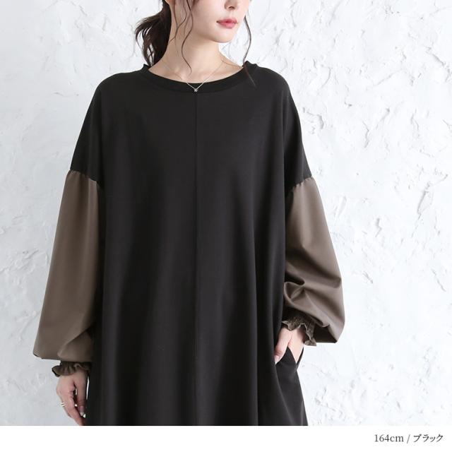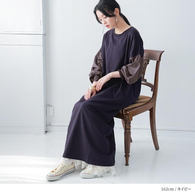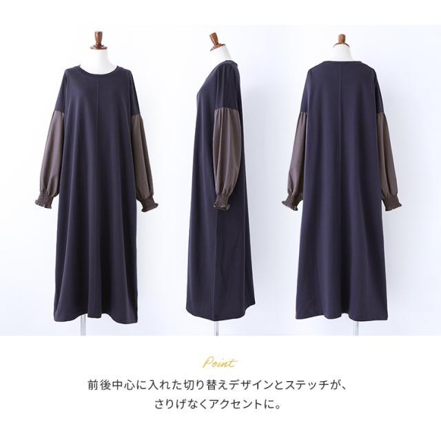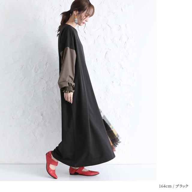 『バイカラー異素材ドッキングワンピース』【メール便不可】【20】[ロングワンピース レディース 春秋冬 長袖 配色 切り替え マキシ丈 シンプル シャーリング バルーンスリーブ ポケット付き]