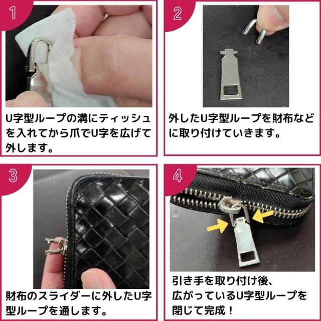 2) 取り付けたい財布・バッグなどのスライダーのリングに、U字型ループ金具を通します。