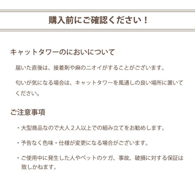 | 内容 | ・キャットタワー本体 ×1(組み立て必要) ・日本語組み立て説明書 ×1 ・組み立て用工具一式(ボルト、ワッシャー、六角レンチ) |