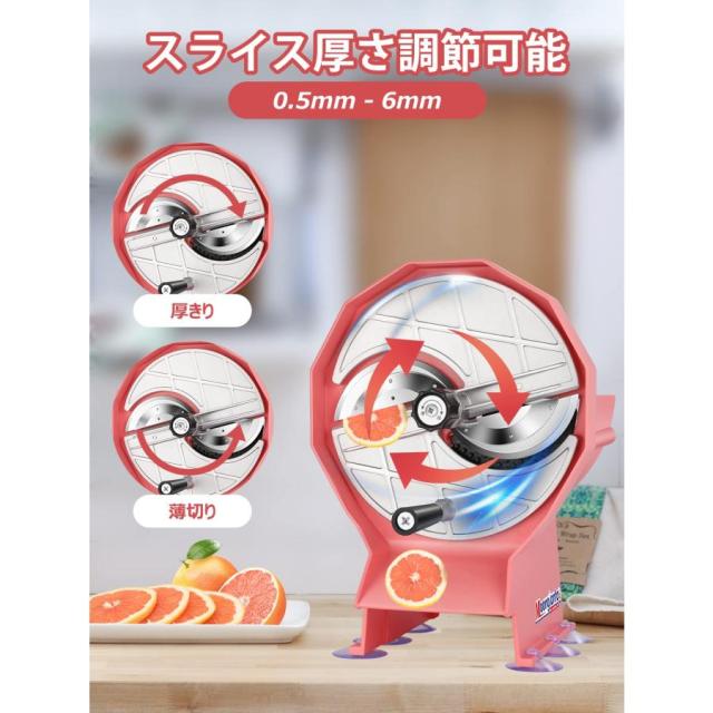 手動スライサー レモンスライサー 果物スライス 切り機 自動送料 0.5~6mmスライス厚さ調整可能 吸盤式マット ステンレス鋼材質 レモン/ドラゴンフルーツ/リンゴ/