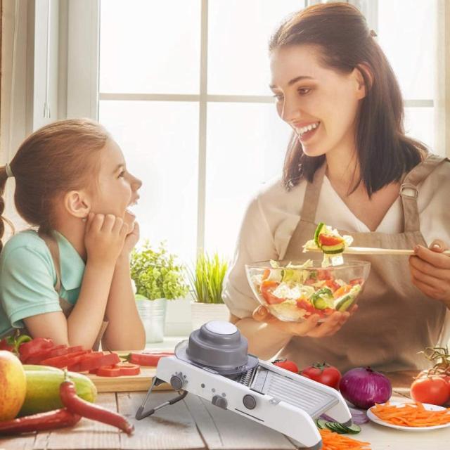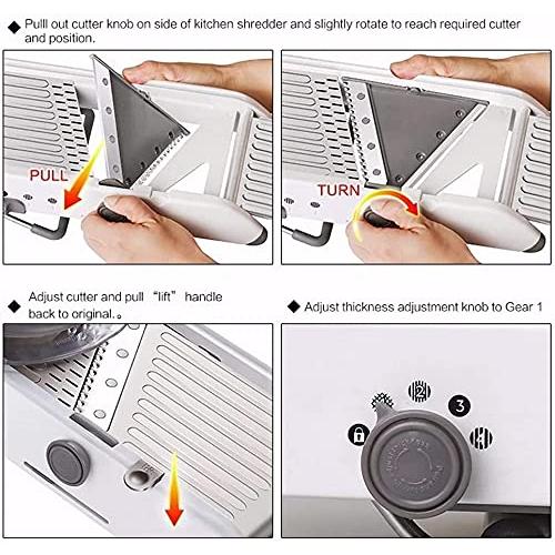 【調節可能なマンドリンスライサー】手でスライスして千切りにしたい場合は、つまみを回すだけで簡単に刃を切り替えることができます。6サイズ調整表示のマンドリンフードスライサーと回転調節可能な刃を内蔵しているので、完全にフラットなスライスと千切りが得られます。 。