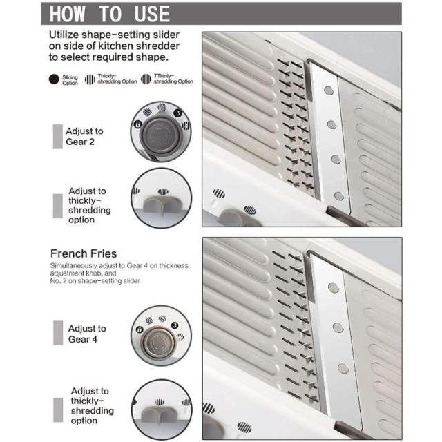 【取り外し可能・交換可能な両面刃】旧マンドリンと比較して、新マンドリンは取り外し可能な両面刃(片面がストレート刃、反対側がシワ刃)にアップグレードされています。スライサー(1mm?6mm)とシュレッド(3mm?6mm)の切り替えが簡単で、しわナイフでワッフルをしっかりカットでき、時間と労力を大幅に節約できます。