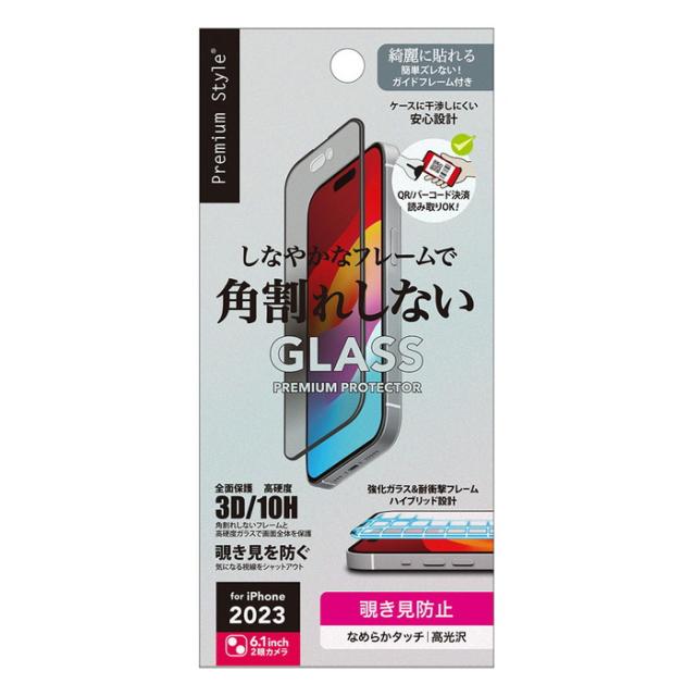 角割れを防ぐふたつの素材を使ったハイブリッド設計のiPhone 15用 液晶全面保護ガラスの覗き見防止タイプです。