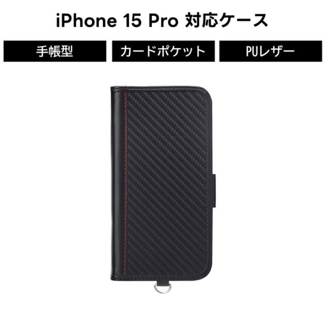 iPhone15 Pro 手帳型 iPhoneケース カード収納 ポケット おしゃれ スマホケース カバー 手帳型ケース スマホカバー アイフォン15 ストラップホール アイフォン カーボン調ブラック ソフト ハード ポケット付き 人気 耐衝撃 キャラクター大人可愛い ギフト