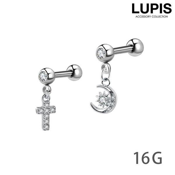 ボディピアス ストレートバーベル 16G クロス ムーン チャーム 揺れる サージカルステンレス 金属アレルギー対応 つけっぱなしOK LUPIS ルピス