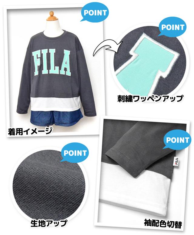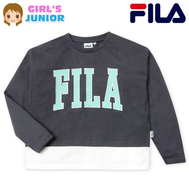 【送料無料】女児 ジュニア FILA 長袖 Tシャツ 重ね着風 綿混 ゆったり 刺繍ワッペン 子供服 女の子 td-0667b-cc【メール便対応】