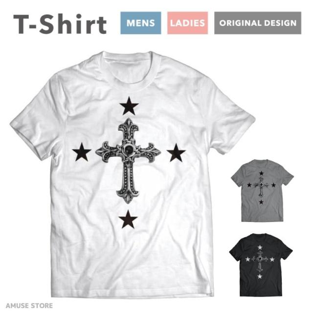 Tシャツ メンズ 半袖 おしゃれ プリント ブラック ホワイト グレー クロス cross Jewel ロック 星BLACK WHITE