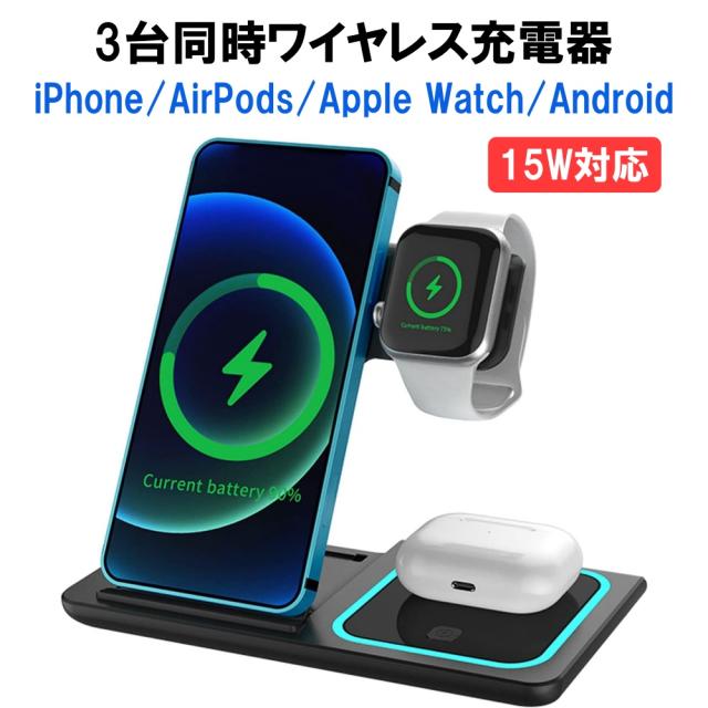 ワイヤレス充電器 スタンド 3in1 15W iPhone Airpods Pro Apple Watch Andriod QI 急速充電 3台 Galaxy Fold HUAWEI ワイヤレス 充電