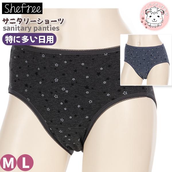 サニタリーショーツ 特に多い日用 アツギ She free 羽根つき対応 綿混 星柄 生理用ショーツ 87464AS M/L おためし