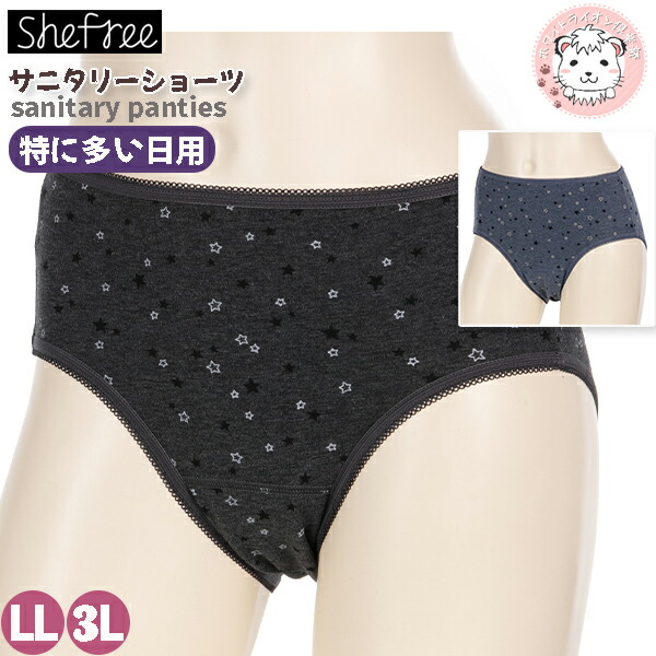アツギ シーフリー 特に多い日用 羽根つき対応 サニタリーショーツ LL/3L | 横モレガード仕様 綿混 星柄プリント 生理用ショーツ 87464QS ATSUGI Shefree