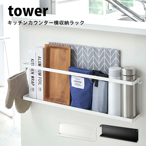 タワー キッチン収納 キッチン カウンター ラック 石こうボード サイドラック 収納 アイデア 横 tower 山崎実業 キッチン 雑貨 白 黒 ホワイト ブラック
