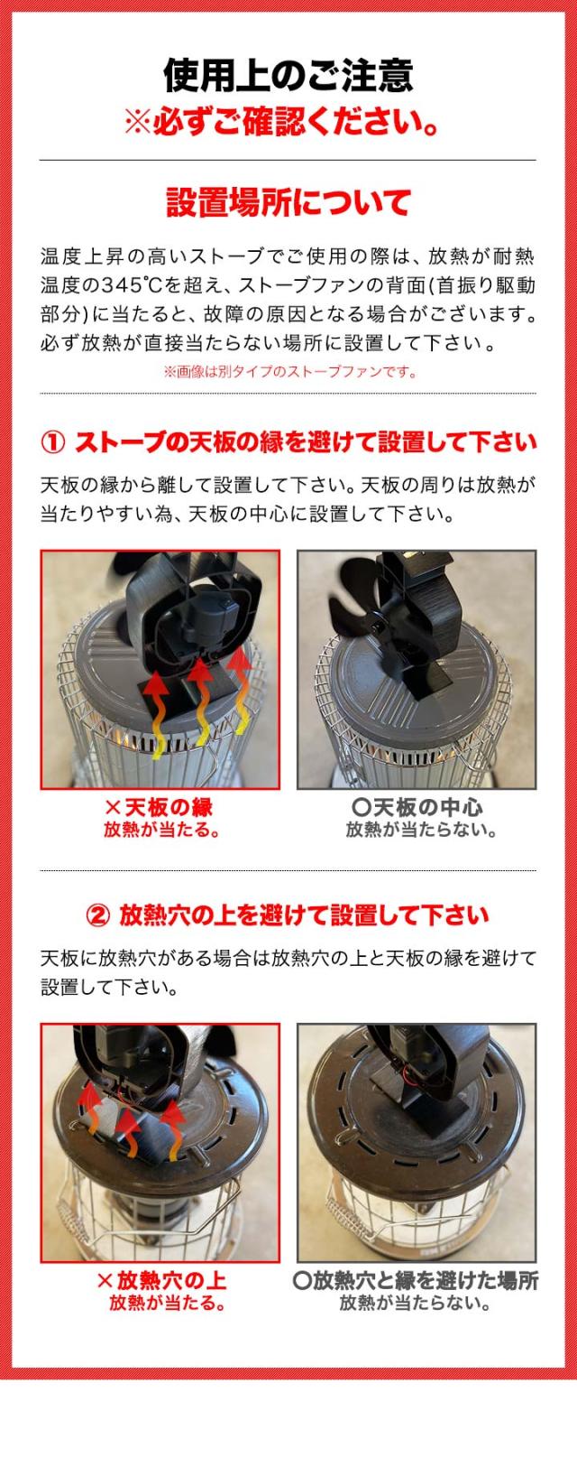 | 特記事項: ・ご使用後は本体が非常に熱くなっています。移動するときは必ず手袋を着用してください。 ・作動中は羽根に触れないように気をつけて下さい。 ・ストーブの表面の温度が350℃以上になっている場合はご使用をお止め下さい。 ・煙突ストーブの場合は煙突の前に設置せず側面に設置して下さい。 |