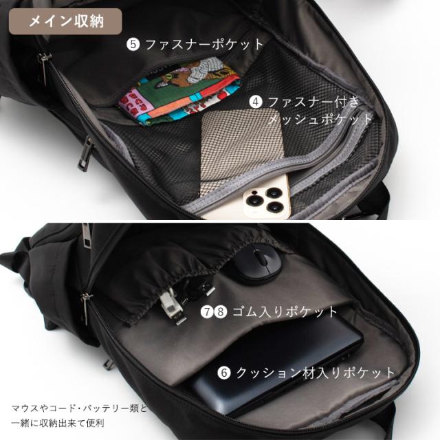●内ポケット:クッション材入りオープンポケット1、オープンポケット2、ファスナー付きポケット2