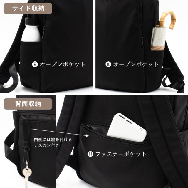 ●外ポケット:前面上部ファスナー付きポケット1、前面下部ファスナー付きポケット2、サイドオープンポケット2、背面ファスナー付きポケット1