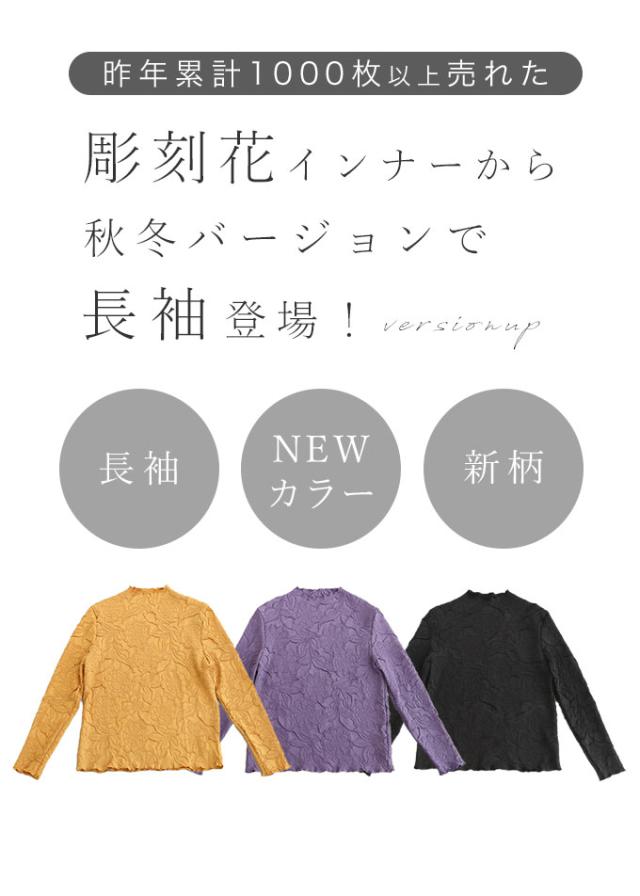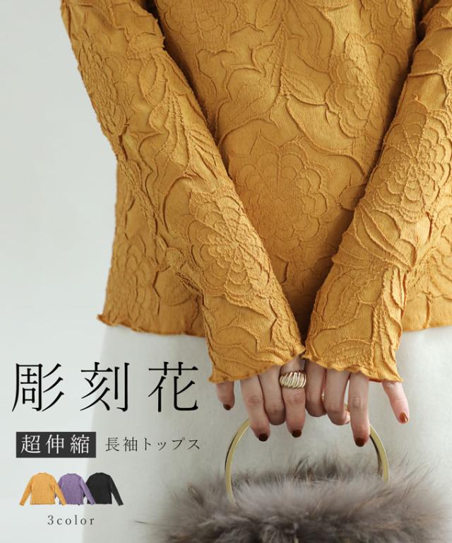 再入荷12月10日 (S~2L対応) 彫刻花 超伸縮 長袖トップス w60287ps cawaii レディース ファッション 他にはない トップス 長袖 彫刻花 総柄 ストレッチ 重ね着 伸びる 伸縮性 のびのび 長そで ロング袖 柄 花 フラワー柄 ブラック パープル イエロー 黒 紫 黄色 母の日
