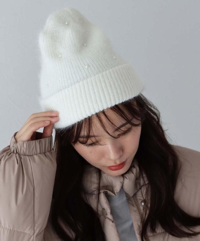 毛足が長めのふわふわとしたアンゴラニットにパールを散りばめたデコラティブなデザインのニットキャップ。