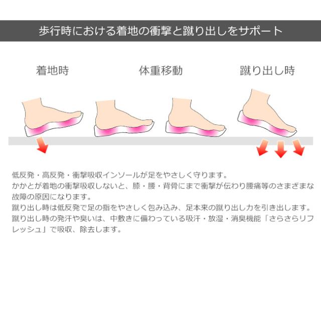 歩行時の衝撃を和らげ、疲れにくく快適な履き心地です。